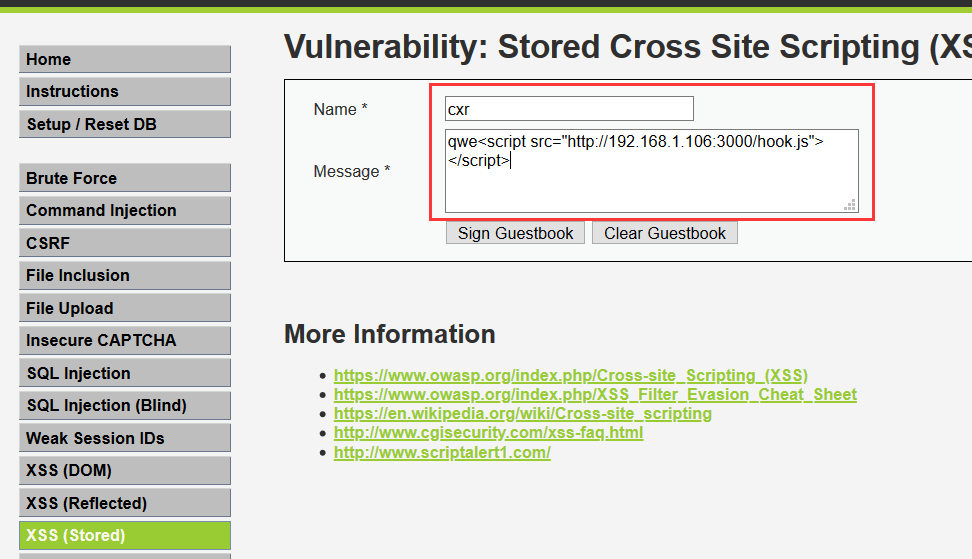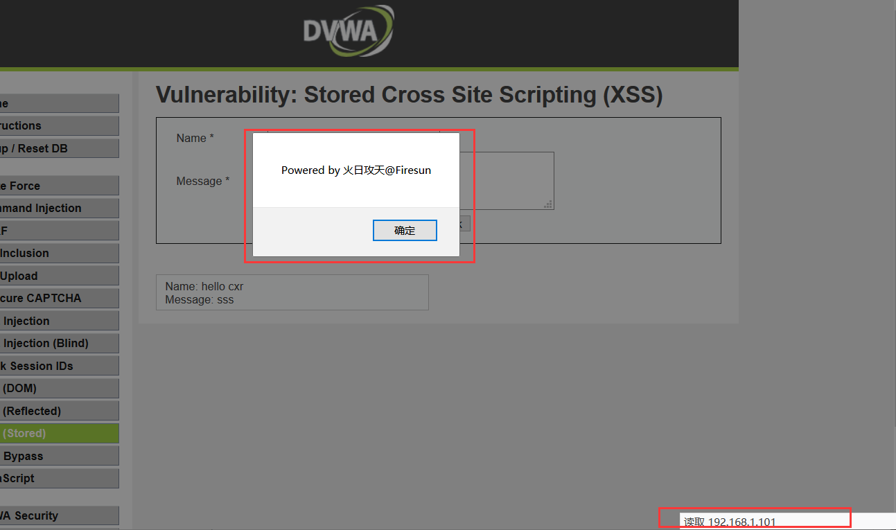 3.在低级别DVWA中的储存型XSS模块,输入js脚本,上传留言,显示下面内容: