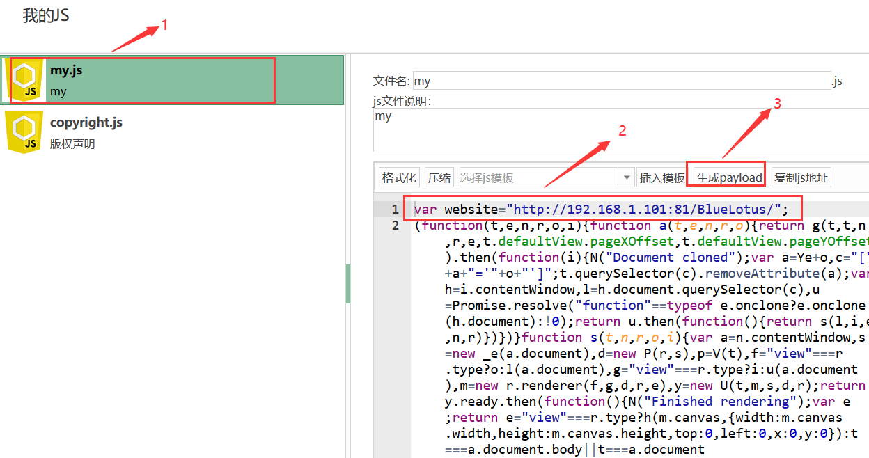 4.同样也可选择其他js脚本,如下图(这里需要将路径修改为攻击者Bluelotus_XSSReceiver的路径):