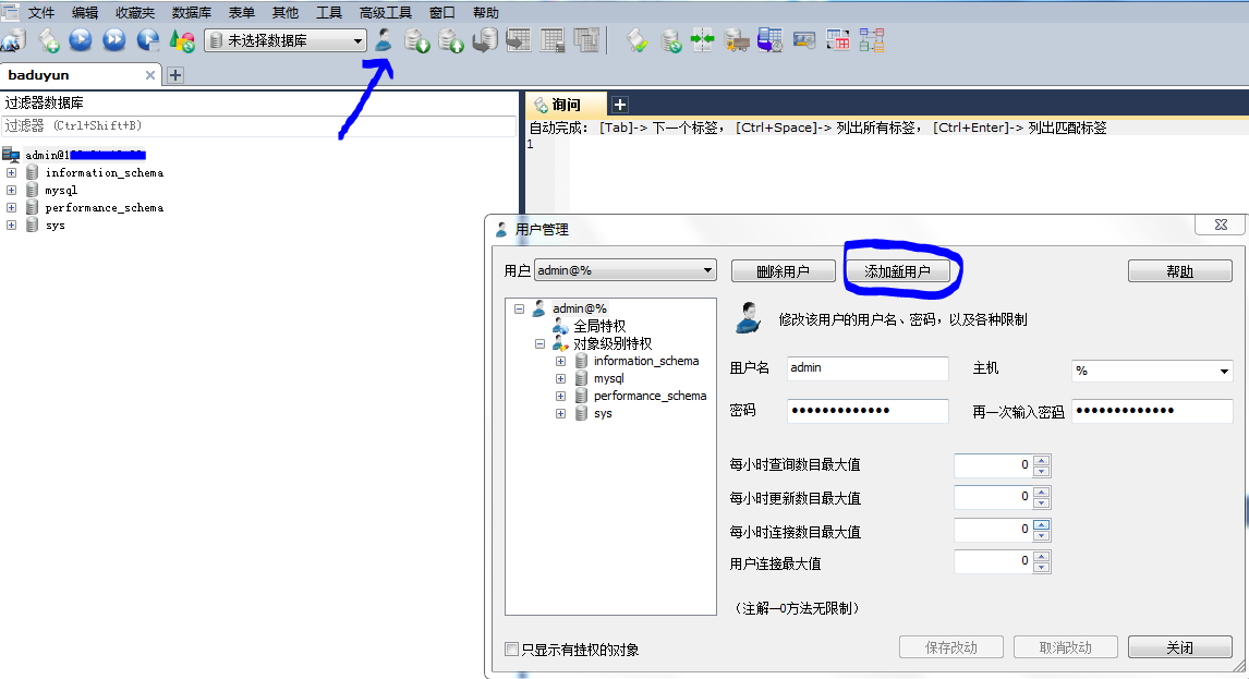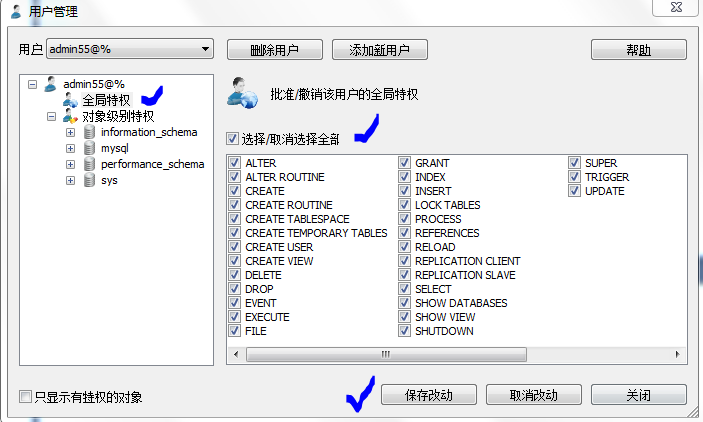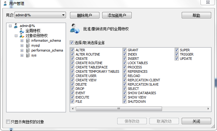 2、点击用户--添加新用户-输入用户名-主机:%--密码--创建---全局特权勾选后--保存改动
