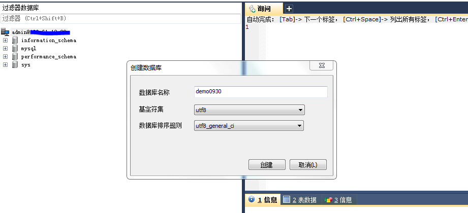 三、 提示可以连接后,可以在云服务器数据库中创建数据库了