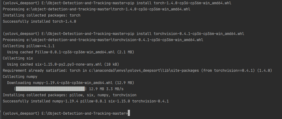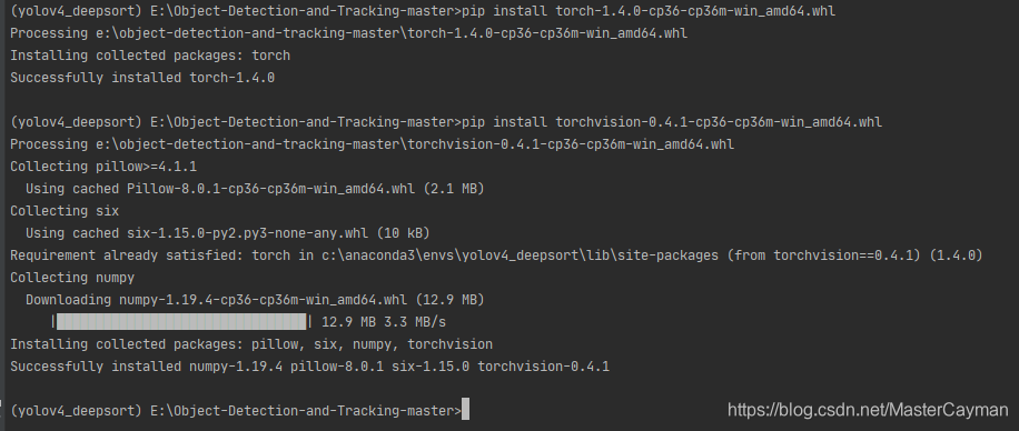 pip install torch-1.3.0+cu92-cp36-cp36m-win_amd64.whl -i https://pypi.tuna.tsinghua.edu.cn/simple/pip install torchvision-0.4.1-cp36-cp36m-win_amd64.whl -i https://pypi.tuna.tsinghua.edu.cn/simple/这里我用命令临时改成了清华的下载源,因为虽然这里已经把torch的whl下载了,但是它有可能要下载其他的库,所以用国内源下载还是会快很多。