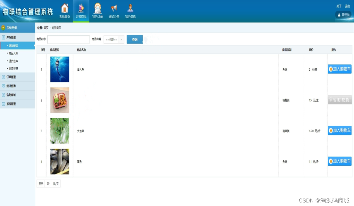 5、商家操作界面:订购商品、我的订单、我的信息、通知公告。