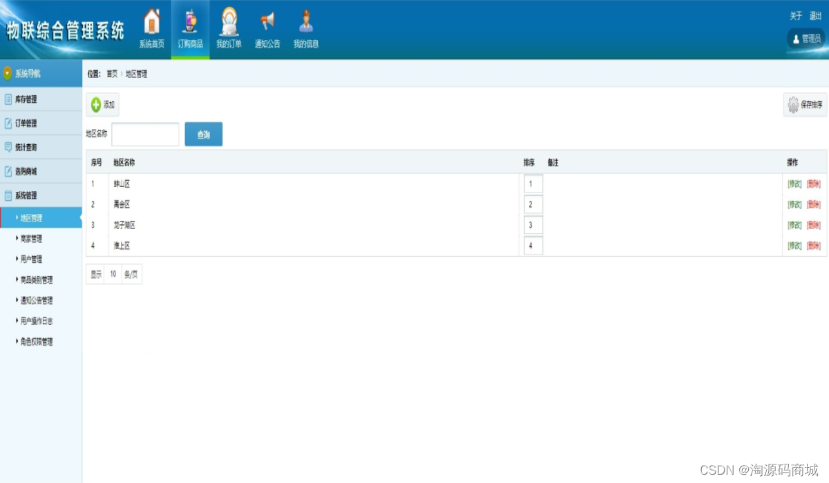 4、系统管理:商品类别管理、商家管理、用户管理、角色权限设置、地区管理、通知公告管理、用户操作日志
