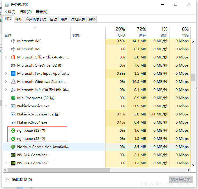 (查看任务管理器,进程里面会有两个nginx的运行文件,这就表明你已经让nginx运行起来了)