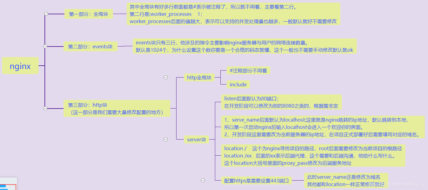 首先nginx配置分为三大部分内容:全局块、events块和http块