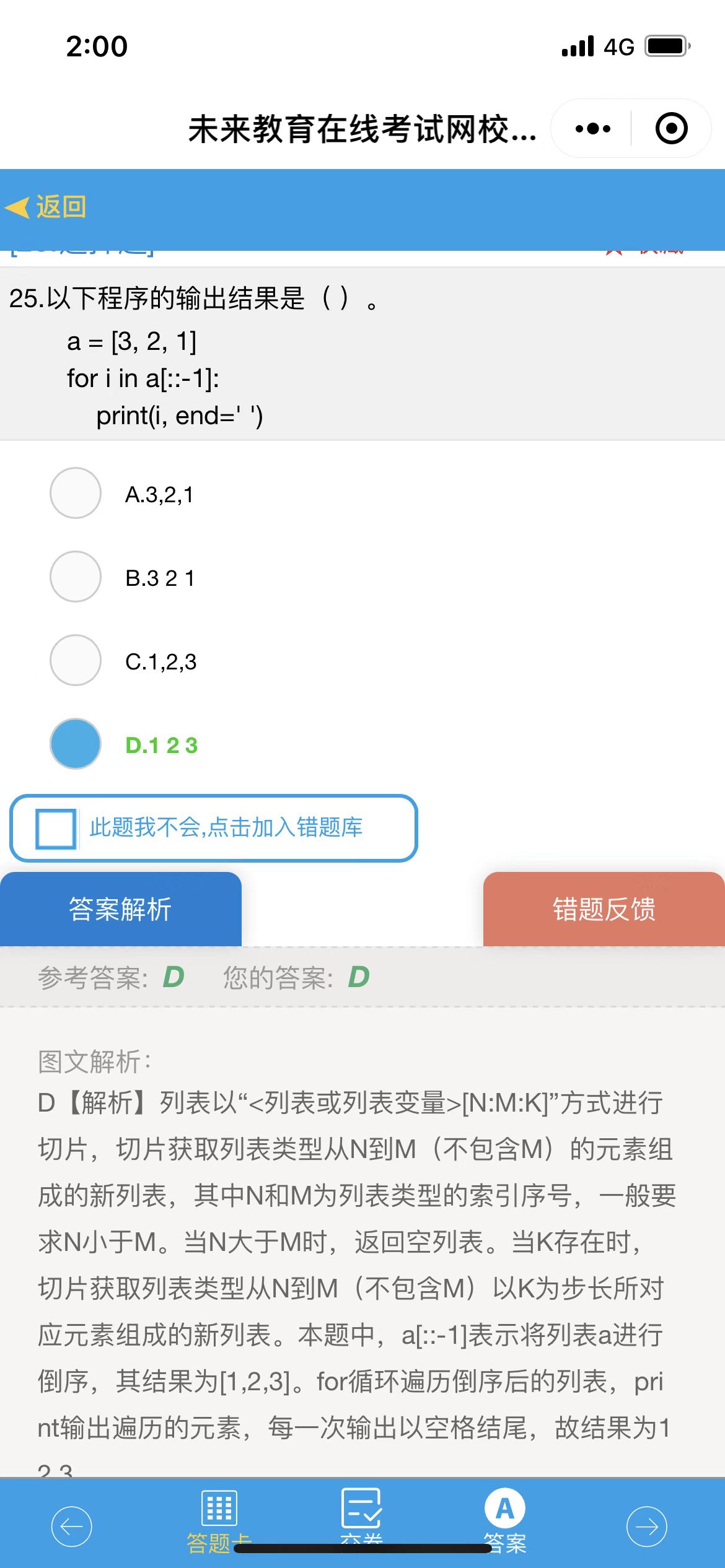 18、字符串切片:步长为负代表从后往前,字符串的第一个位置为0。print(s[5::-2])代表起始点索引为5,结束省略位置,代表切割剩下的所有位置,以步长为2从后向前切割。reverse对字符串进行翻转操作。“python编程是方向”[2:-2]的结果是“thon编程是”