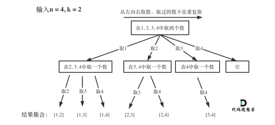 图中n相当于树的宽度,k相当于树的深度。每次搜索到叶子结点,我们就得到了一个结果。只需要把达到叶子结点的结果收集起来,就可以求得n个数中k个数的组合集合。