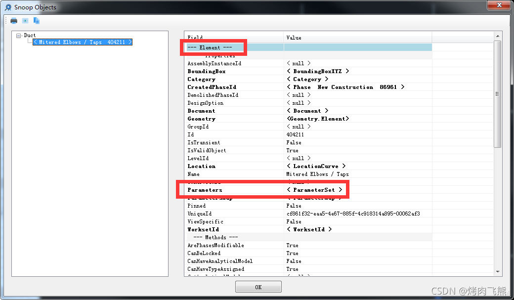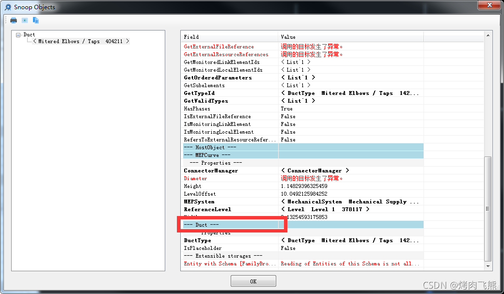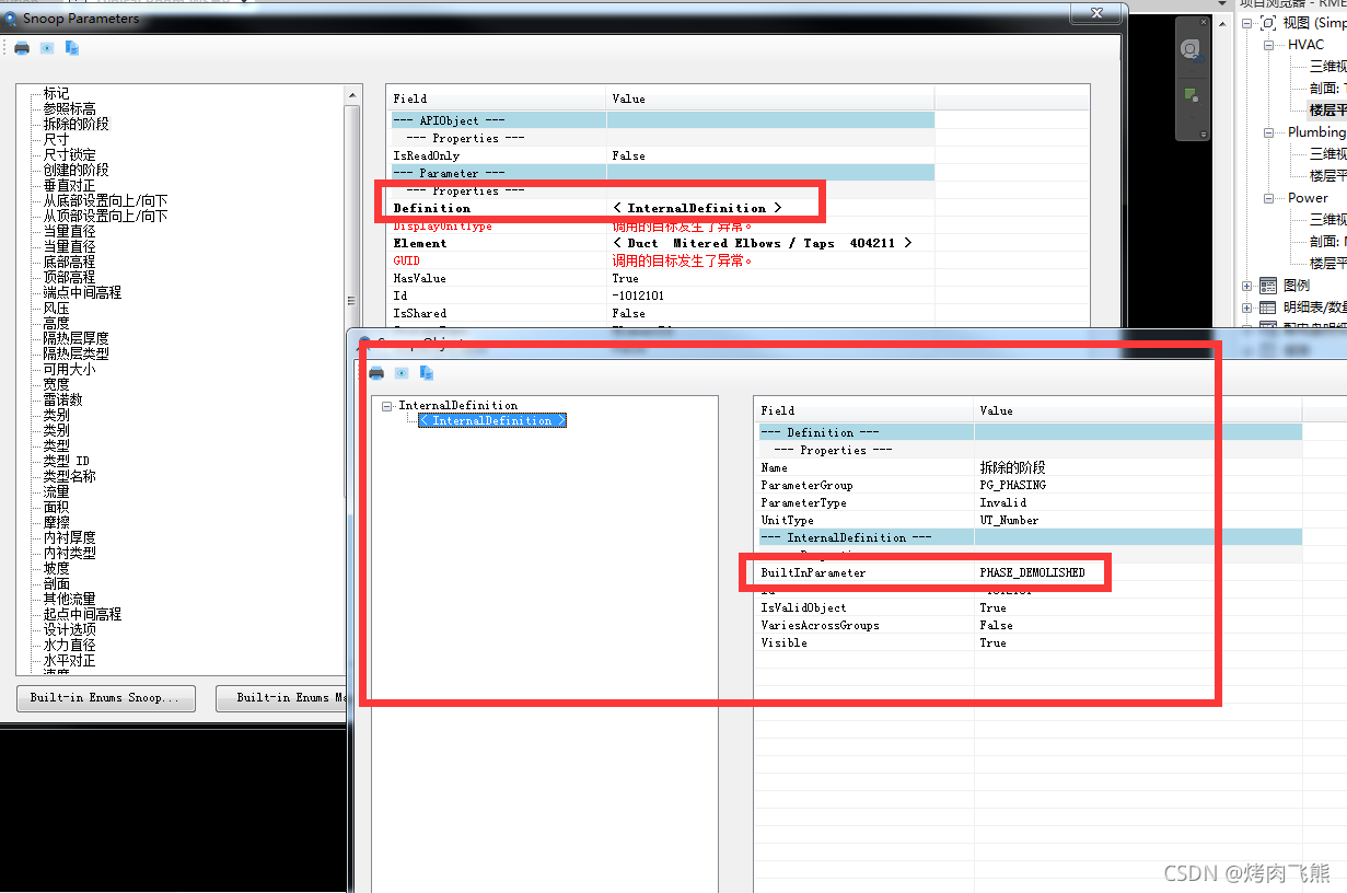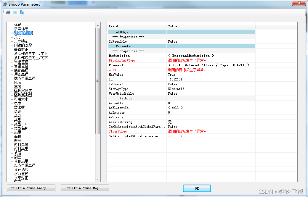 Parameter paramete = duct.get_Parameter(BuiltInParameter.RBS_CURVE_HEIGHT_PARAM);代码中是使用这一段来进行调用,其中 builtinparameter 是每个属性自带的一个参数值,可以通过 Definition 进入,然后找到相对应的参数段,即可进行调用
