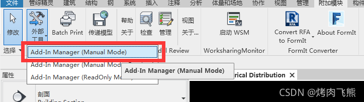 二、通过revit中的 附加模块 ==》外部工具==》add in manager 可以边更改代码边调试