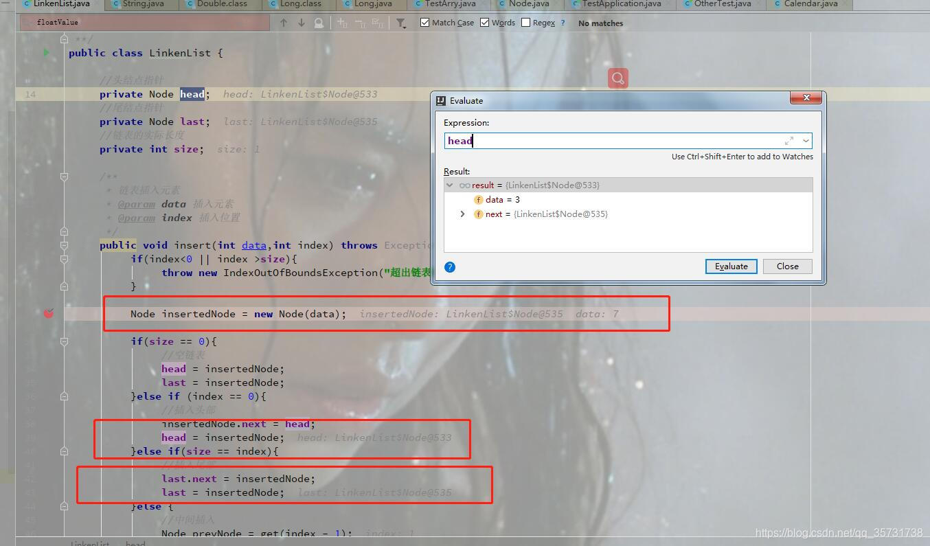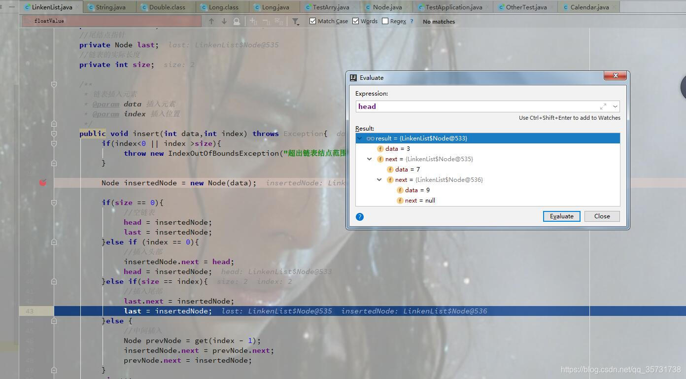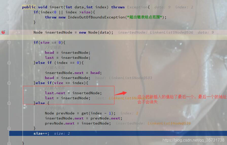 在last =insertedNode 赋值以后会发现原本head的地址是533,last的地址是535, 此时插入的是第二个值,head的next的引用地址指向了 下一个节点对象,