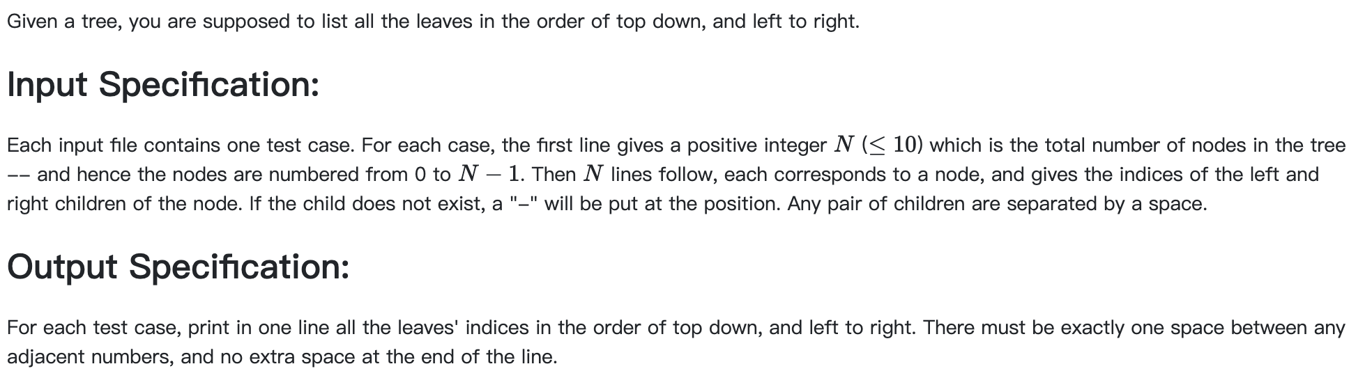 每个输入文件包含一个测试用例。 对于每种情况,第一行给出一个正整数N ( ≤ 10 ) N(≤10)N(≤10),它是树中节点的总数。节点从0 00到N − 1 N-1N−1编号。 然后跟随N NN行,每行对应一个节点,并给出该节点左右子节点的索引。 如果孩子不存在,将在该位置放置一个“-”。 任何一对孩子都用空格隔开。