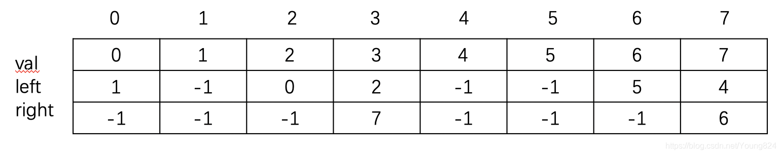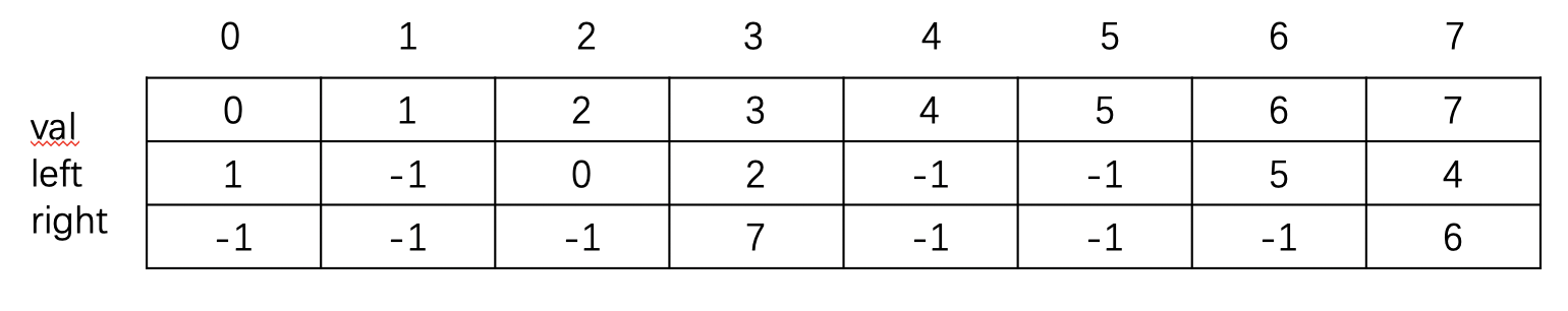 其中最上面的一排代表数组的下标,left代表该结点对应左子树结点在数组中的下标,right代表该结点对应右子树结点在数组中的下标。-1代表相应的子树为空。