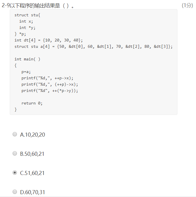 (6)第三个printf语句,括号内先运算,箭头优先,访问到第二个结构体变量的指针变量y并进行解引用,得到定义数组中的第二个元素20,再进行++,得到21;