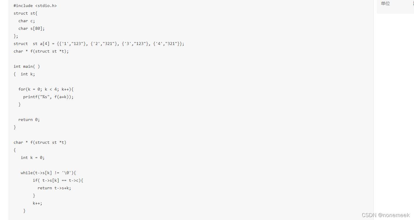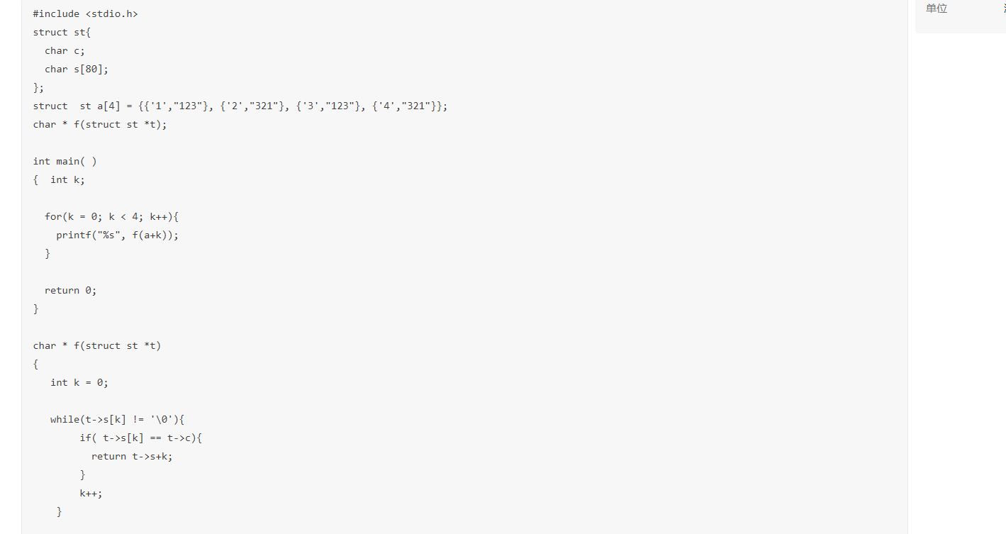 这个题目的意思就是,在s[80]字符串里里找字符c,找到了就输出字符串里的c开始后面所有的字符直到\0出现,如第一个循环,找到1后,发现1就是第一个字符串的第一个元素,所以返回s+k时,再输出就是123,又如第四个循环,找不到,那就返回原字符串