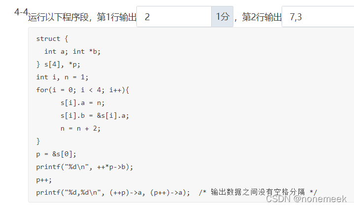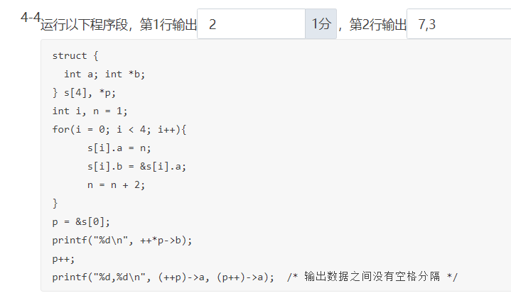 (4)右1运算,p先指向第三个结构体变量,然后访问该变量成员a,得到3