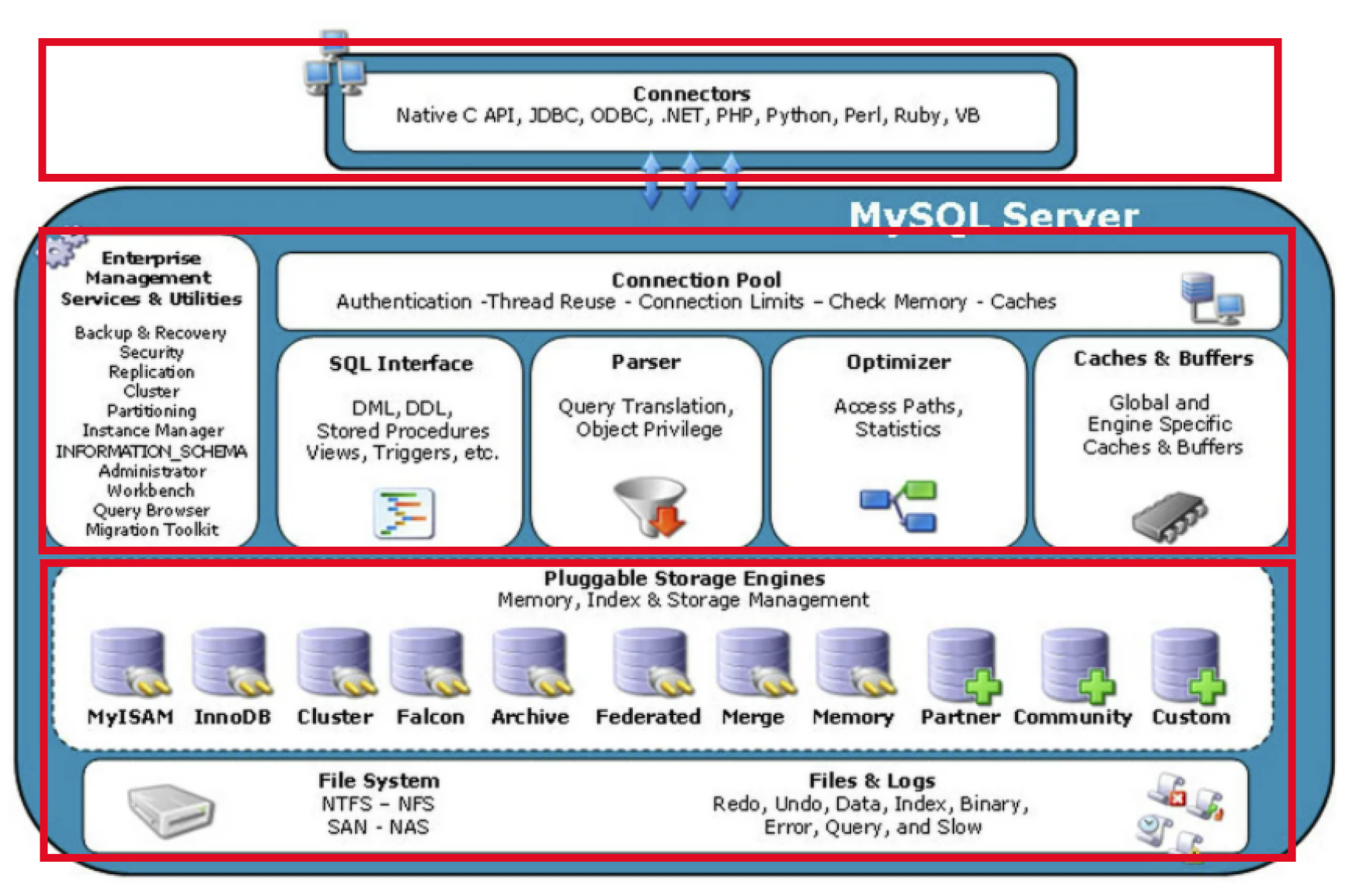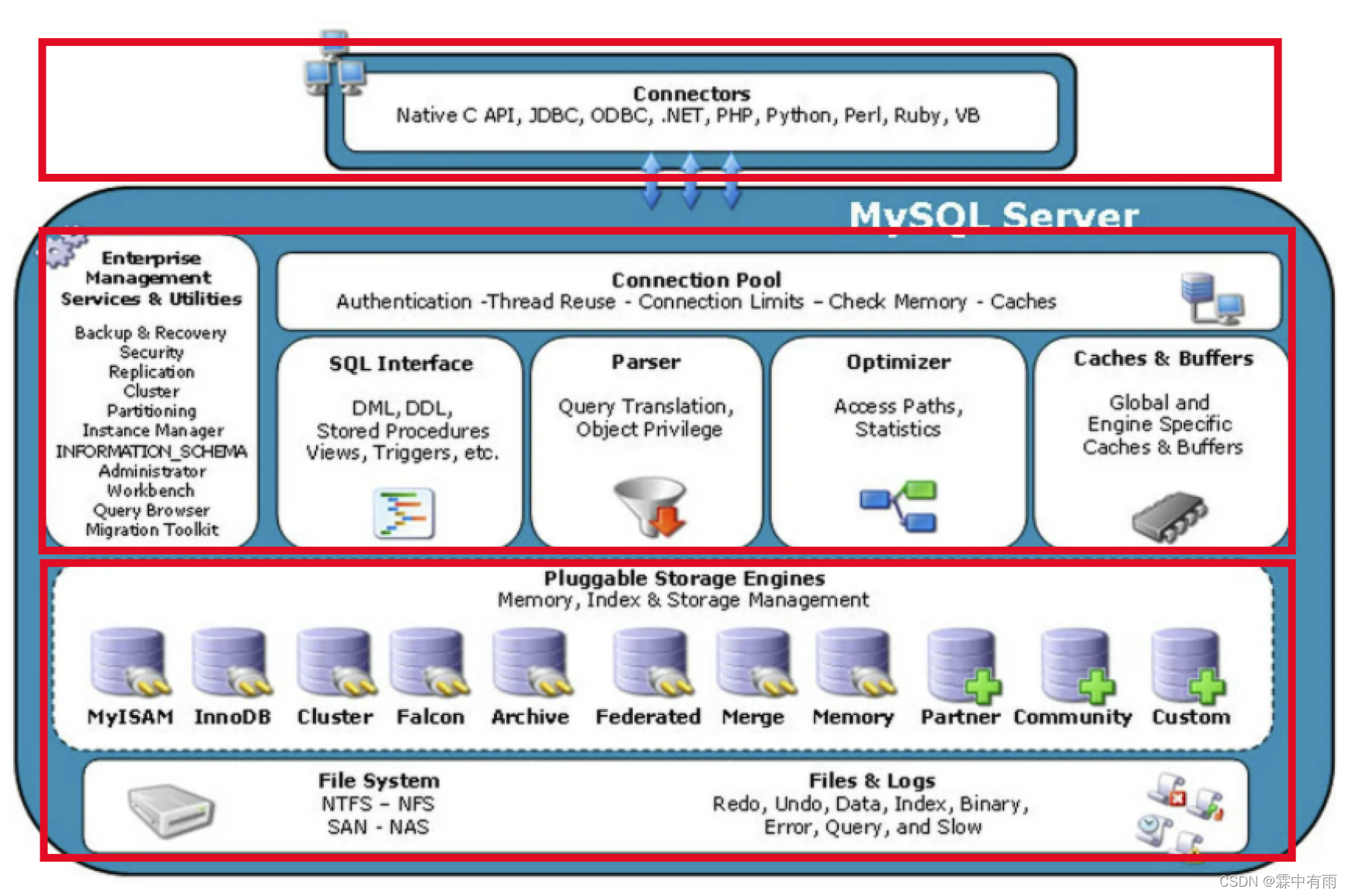 Enterprise Management Service(管理器):mysql的集成管理,例如对数据的管理,如备份,恢复,和数据库安全的管理,以及各组件之间的管理