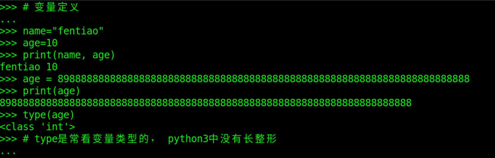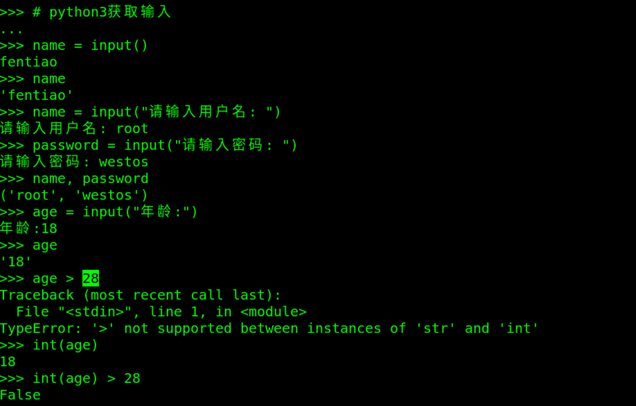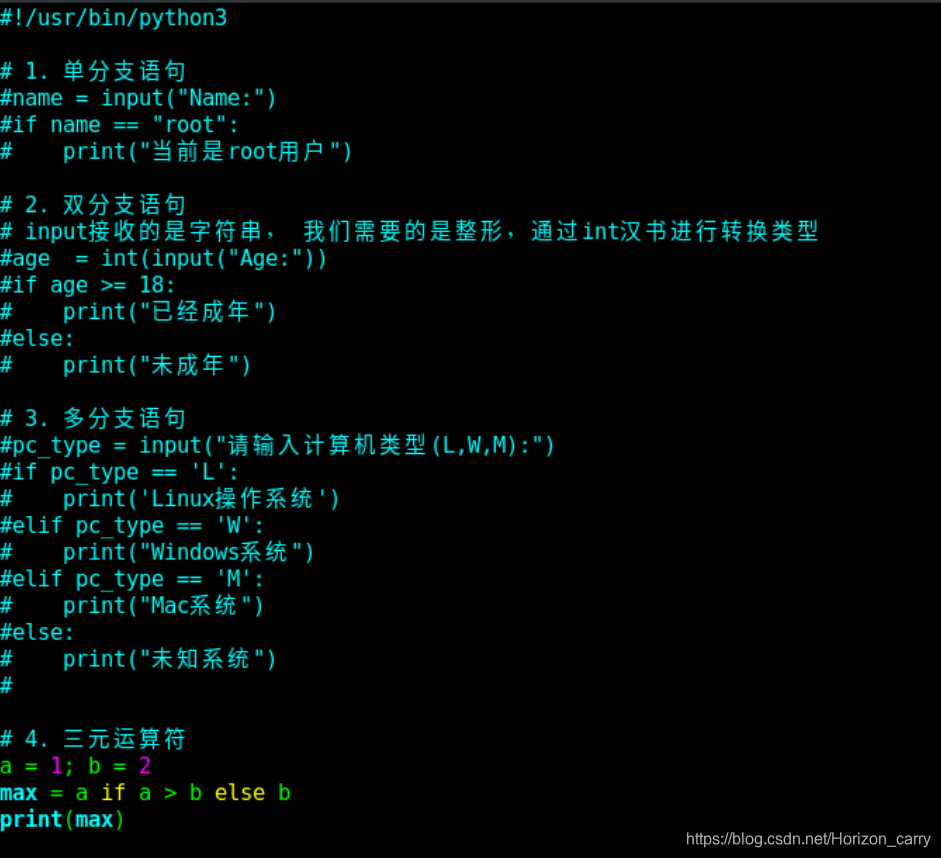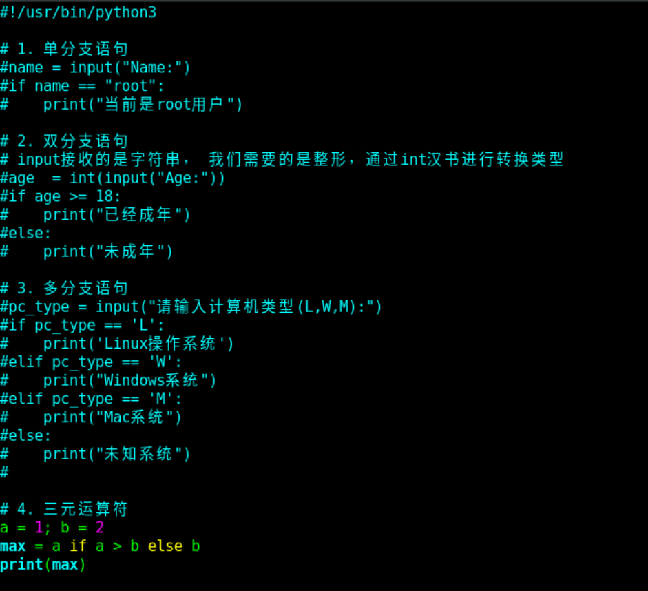 #!/usr/bin/python3 #1 单分支语句 name = input("Name:") if name == "root": print("user is root") #2 双分支语句 age = int(input("Age:")) if age >= 18: print("adult") else: print("no adult") #3 多分支语句 pc_type = input("please input computer type(L,W,M):") if pc_type == 'L': print("Linux pc_type") elif pc_type == 'W': print("Windows pc_type") elif pc_type == 'M': print("Mac pc_type") else: print("Not know pc_type") #4 三元运算符 a = 1; b = 2 max = a if a > b else b print(max)