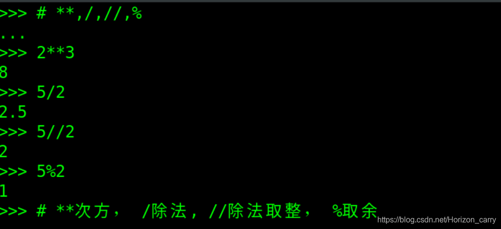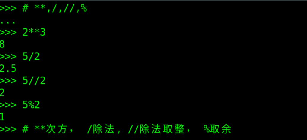 + 加法 - 减法 * 乘法 ** 次方 / 除法 // 除法取整 % 除法取余 and,or,not 逻辑与,或,非