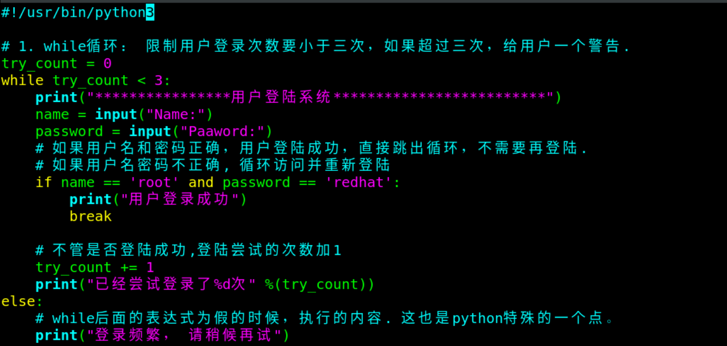 #!/usr/bin/python3 try_count = 0 while try_count < 3: print("**************") name = input("Name:") password = input("Passwd:") # if name == 'root' and password == 'westos': print("user is ok") break try_count += 1 print("try %d count" %(try_count)) else: print("try count is more, please wait try")