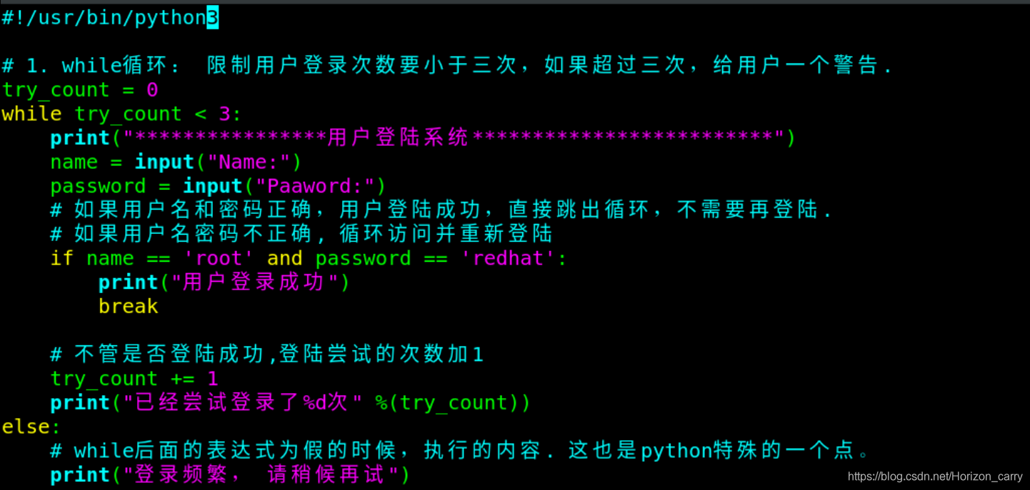 2.while循环实现用户登录小于三次,第三次失败给予警告