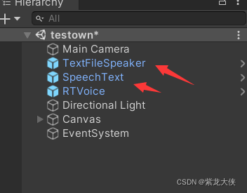 RTVoice添加进去场景中,本案例将另外两个也添加到场景。