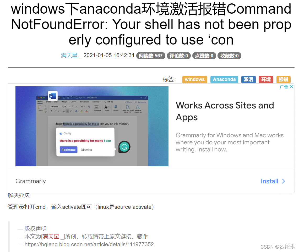 windows下anaconda环境激活报错CommandNotFoundError: Your shell has not been properly configured to use ‘con