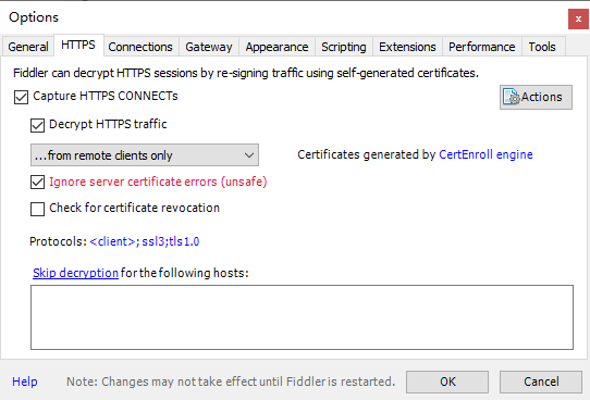 - 打开Fiddler菜单项Tools-> Options->HTTPS,