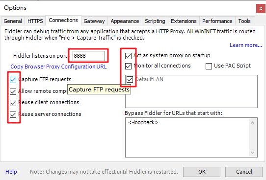 上一步窗口中点击Tools-> Options->Connections,勾选allow remote computers to connect,默认监听端口为8888(下图Fiddler listens on port就是端口号),若端口被占用可以设置成其他的,配置好后要重新启动fiddler,如下图: