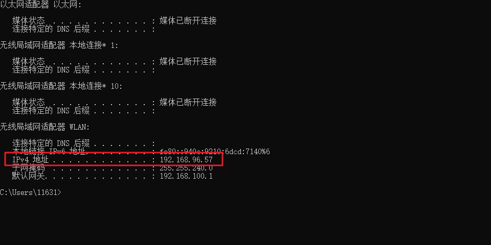 然后要知道电脑的ip地址(当然这个电脑是安装fiddler的电脑),电脑ip地址可通过cmd,输入ipconfig查询,或网络共享中ipv4找到,我的是192.168.96.57,