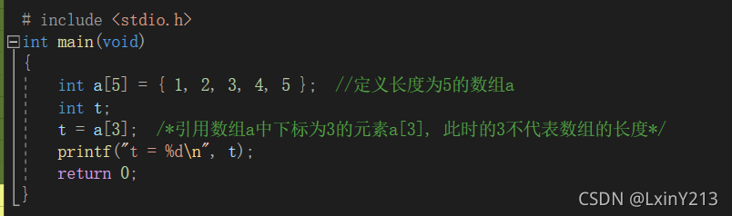 “int a[5];”是定义了有 5 个元素的数组,这 5 个元素分别为 a[0]、a[1]、a[2]、a[3]、a[4]。而 t=a[3] 中的 a[3] 不是数组,只是其中的元素 a[3]。
