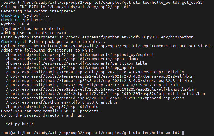 cd /home/study/wifi/esp/esp32/esp-idf/examples/get-started/hello_world执行命令 get_esp32