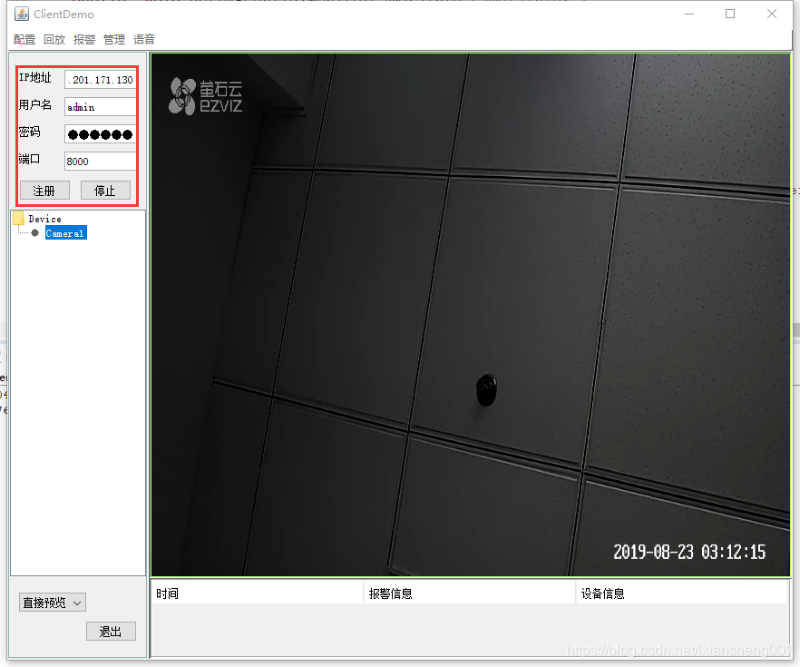Java版本实现单通道结果如图,在红框内输入摄像头的数据--单机注册--预览就可以看到右边摄像头实时画面了。