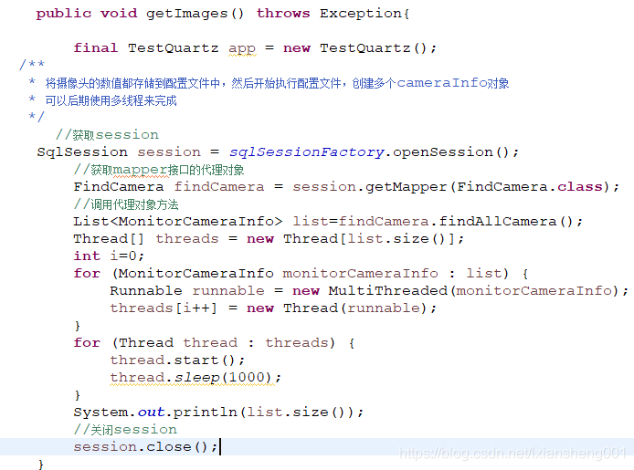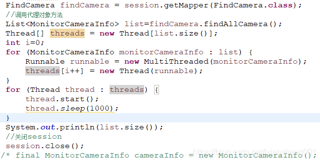 (3)多线程通道开启,首先查询数据库获取摄像头总个数,然后根据摄像头个数创建对应的线程数,第二 遍历摄像头集合,创建对应的MultiThread对象,将摄像头作为构造参数赋值;第三开启线程,并配合sleep方法。