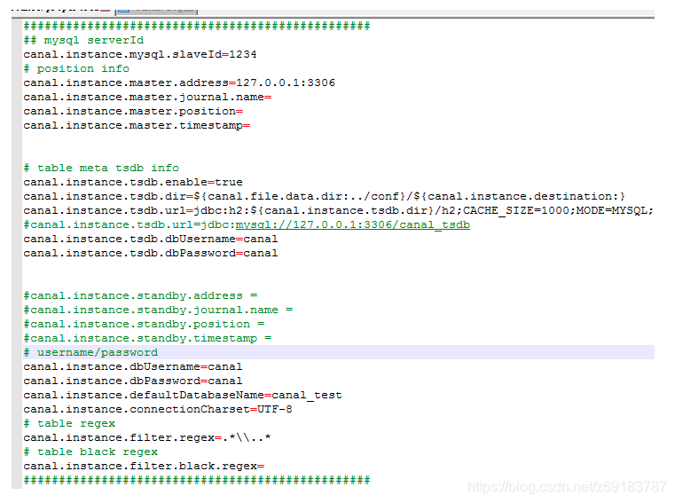 canal.instance.tsdb.dbPassword=canal注:这里的slaveId=1234不能和my.ini的一样