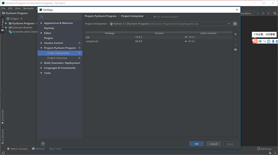 File- setting- projects(项目文件夹在开始open里打开) project interpreter—寻找python.exe位置(一般会自动寻找)