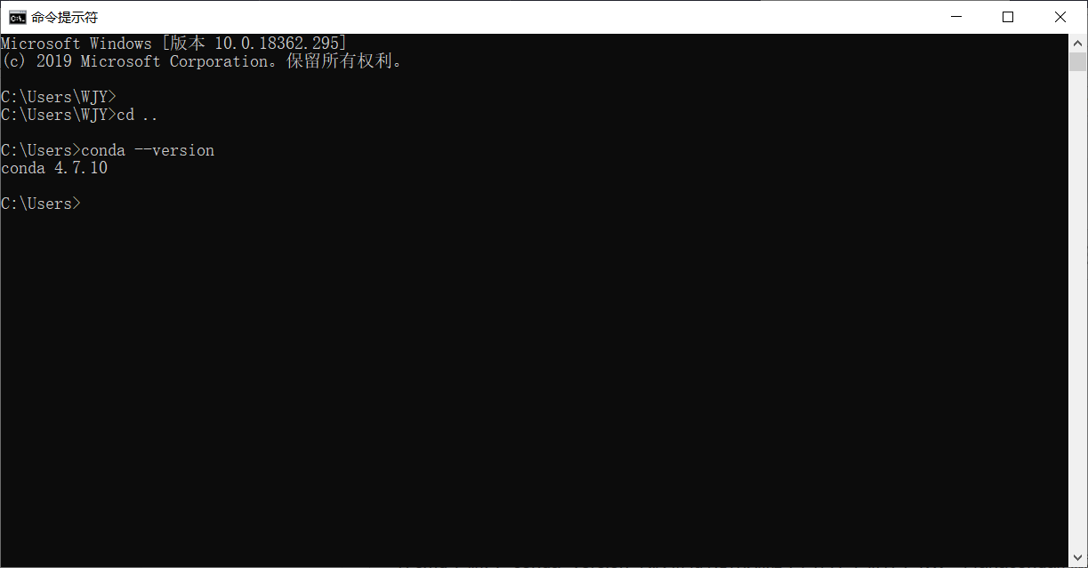 在cmd中输入" conda -version" 成功的话会出现如下内容,同时也可以查看anaconda的版本。