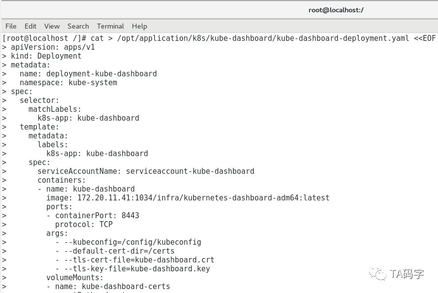 cat > /opt/application/k8s/kube-dashboard/kube-dashboard-deployment.yaml <<EOF