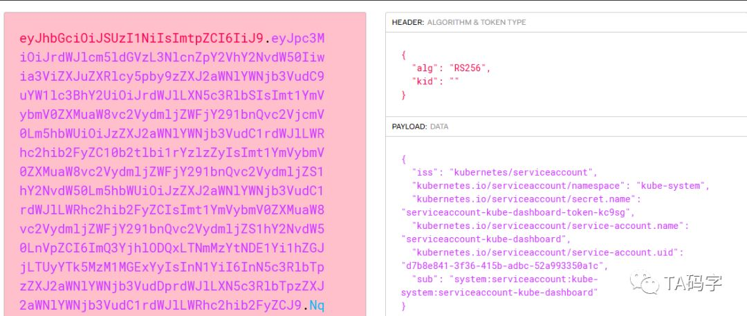 本质上kube-dashboard access token是一个jwt,我们可以在工具网站https://jwt.io/上查看这个jwt。