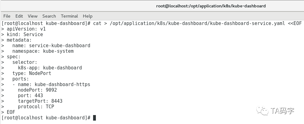 cat > /opt/application/k8s/kube-dashboard/kube-dashboard-service.yaml <<EOF