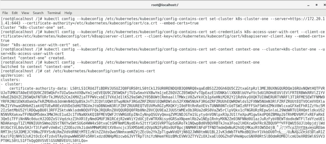 kubectl config --kubeconfig /etc/kubernetes/kubeconfig/config-contains-cert set-cluster k8s-cluster-one --server=https://172.20.11.41:6443 --certificate-authority=/etc/kubernetes/kubeconfig/cert/ca.crt --embed-certs=true