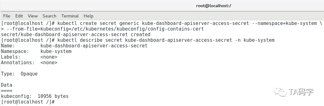 kube-dashboard需要访问kube-apiserver来得到集群中的对象资源,我们的kube-apiserver的访问需要kubeconfig文件。这里我们提前制作好(可以参考以前文章里安装kubectl的时候制作kubeconfig文件),然后以secret的形式存储在k8s里,挂载给kube-dasboard容器作为配置使用。