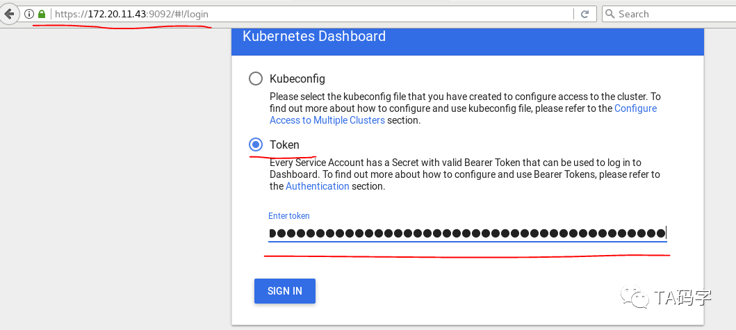 检查kube-dasboard access token: