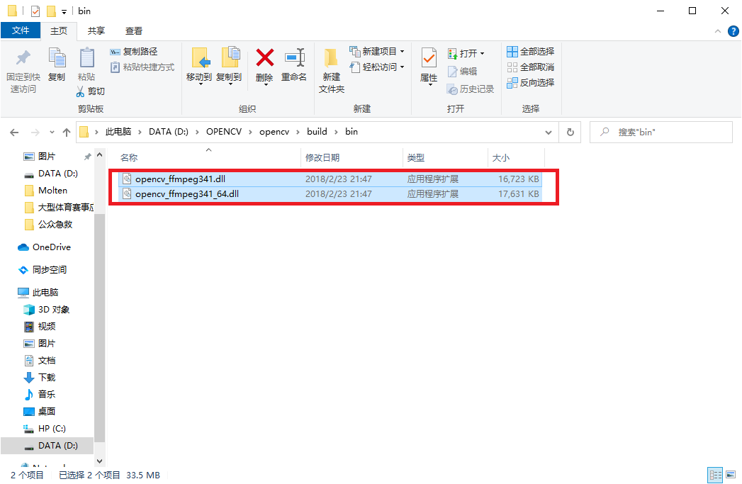 (1)将bin目录(D:\OPENCV\opencv\build\bin)下面的opencv_world341.dll和opencv_world341d.dll文件复制