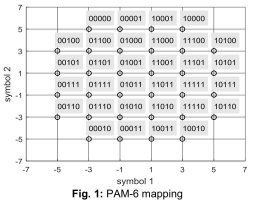 PAM-6调制格式可以携带log2(6)=2.585位/符号。本文介绍一种非常简单的次优编码算法,将五个比特映射成两个符号。