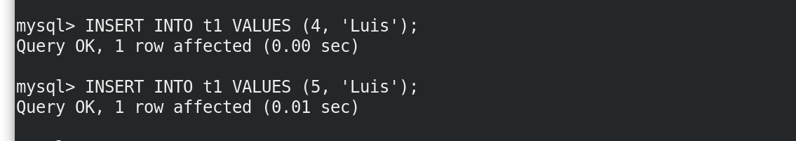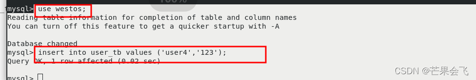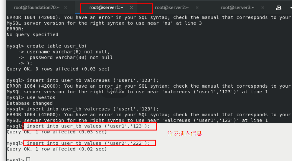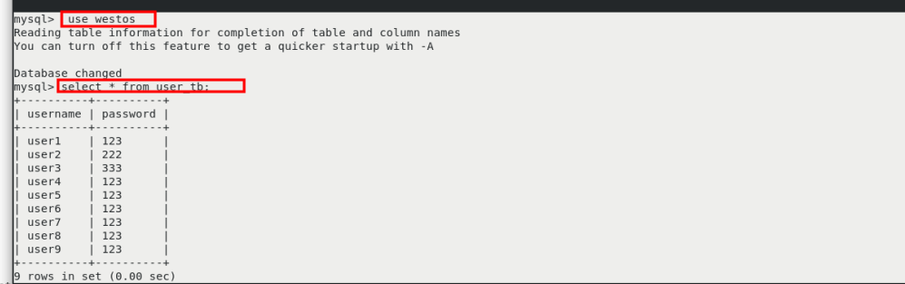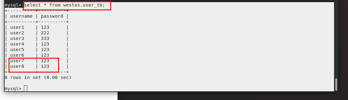 mysql -pwestos -->use westos -->insert into user_tb values ('user1','123'); -->insert into user_tb values ('user2','123');