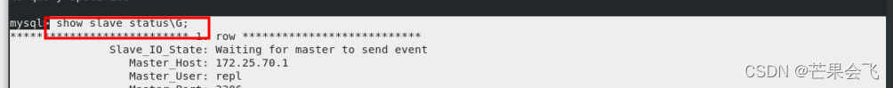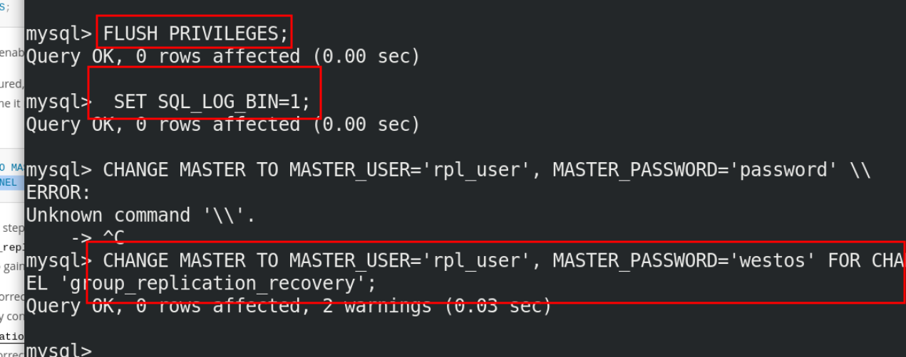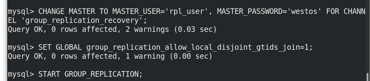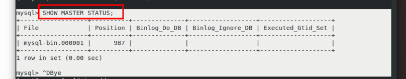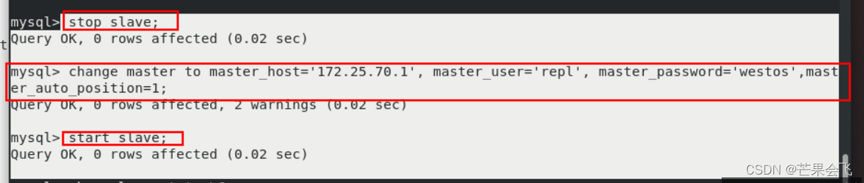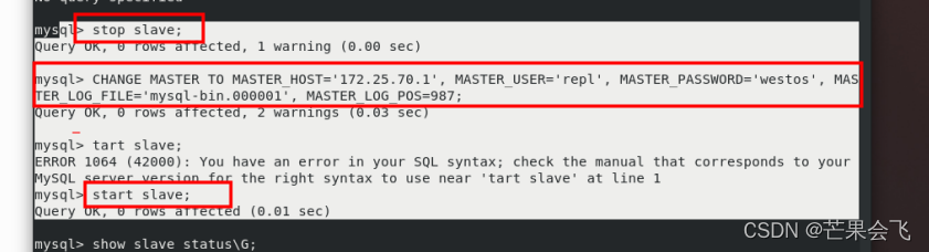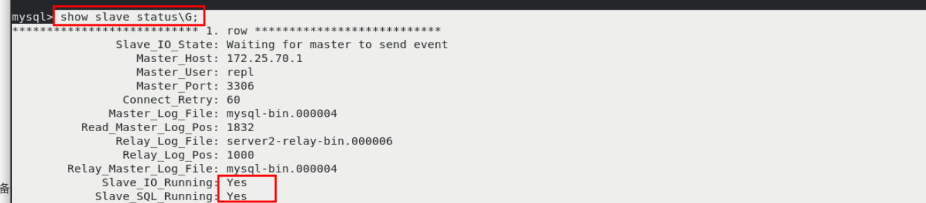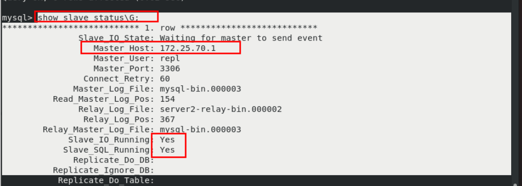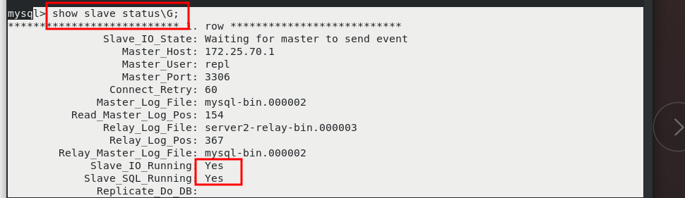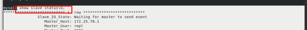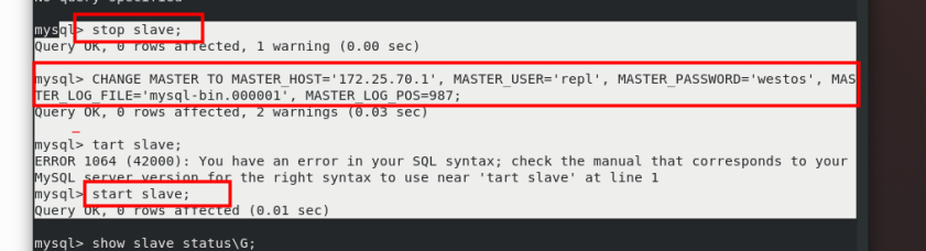 -->CHANGE MASTER TO MASTER_HOST='172.25.70.1', MASTER_USER='repl', MASTER_PASSWORD='westos', MASTER_LOG_FILE='mysql-bin.000001', MASTER_LOG_POS=987;