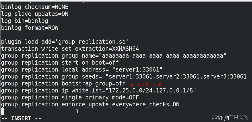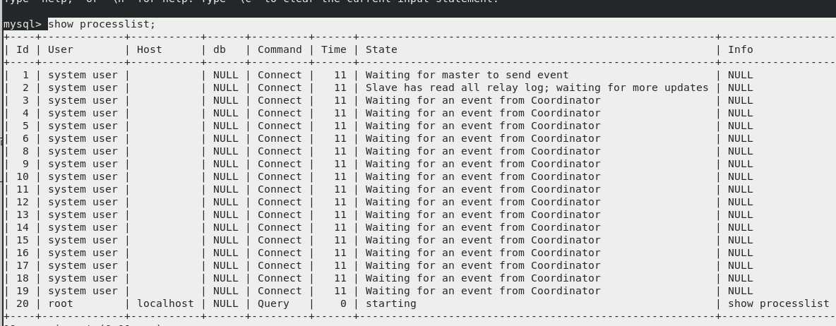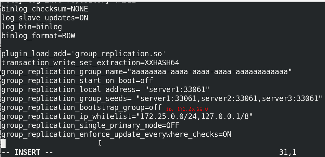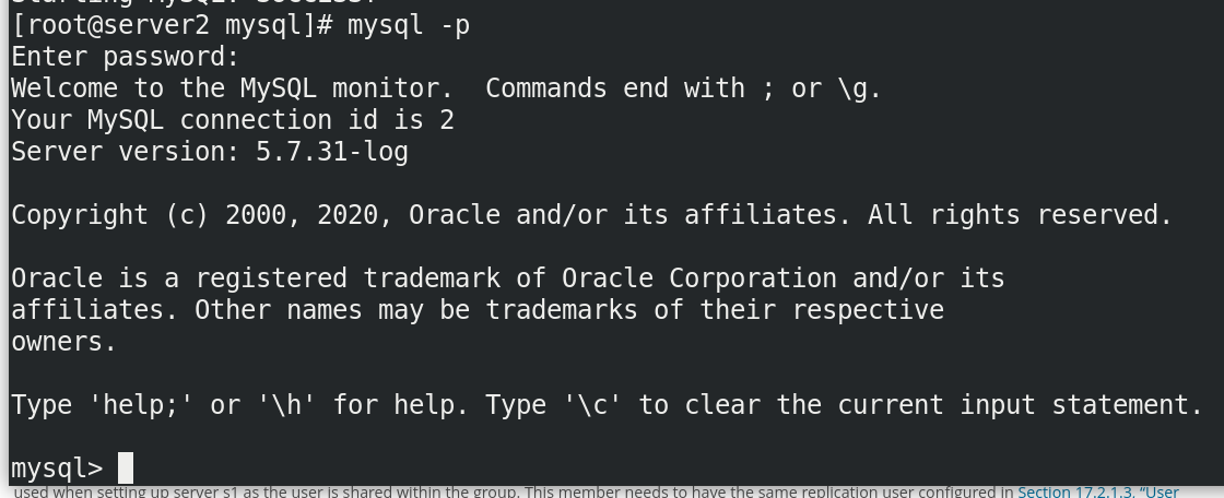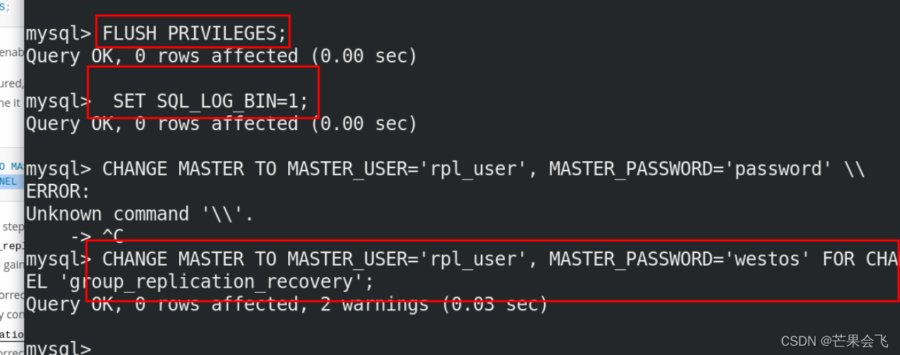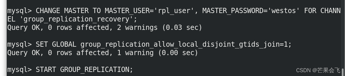 -->CHANGE MASTER TO MASTER_HOST='172.25.70.1', MASTER_USER='repl', MASTER_PASSWORD='westos', MASTER_LOG_FILE='mysql-bin.000001', MASTER_LOG_POS=987;