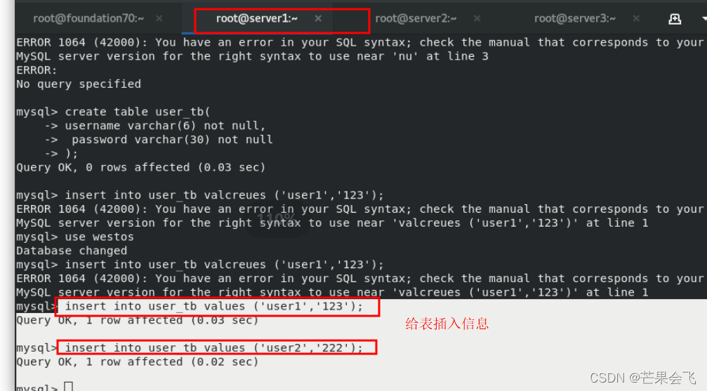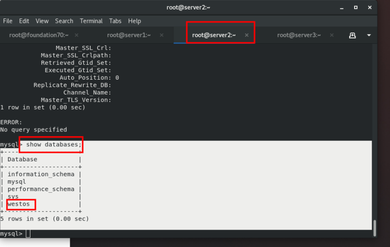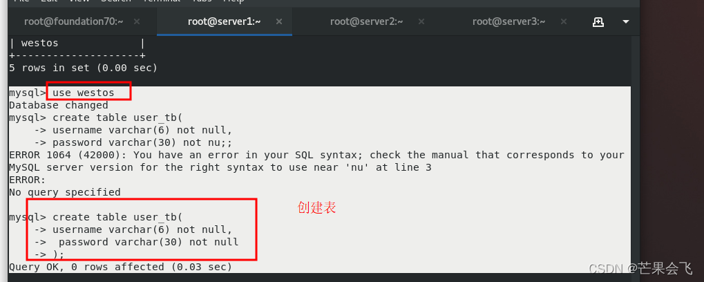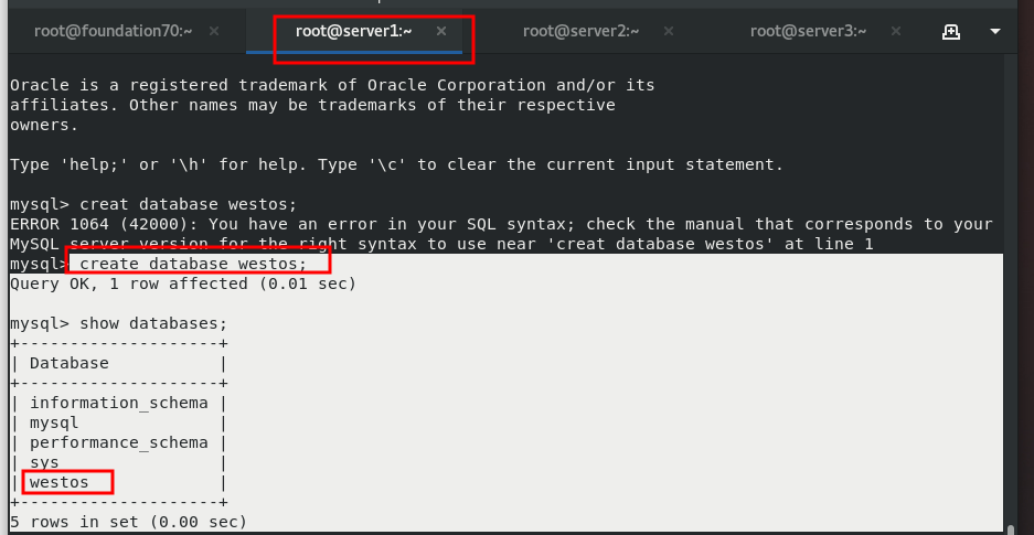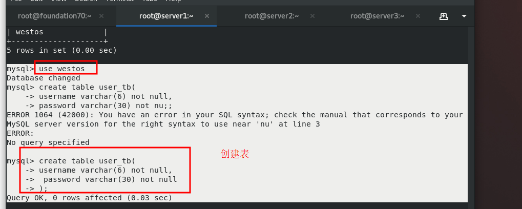 cd ~ vim dump.sql mysqladmin -pwestos create westos mysql -pwestos westos < dump.sqlmysql -pwestos -->show databases;#可以看到从主机中同步过来的westos数据库 -->use westos -->select * from user_tb;server1主机中: