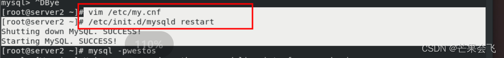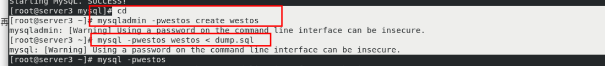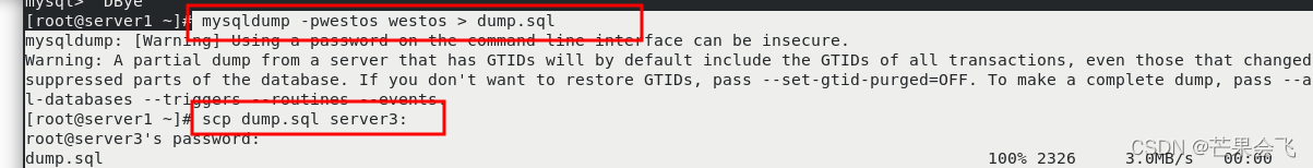 server1主机中:mysqldump -pwestos westos > dump.sql vim dump.sql #查看刚导入的库 scp dump.sql server2: #把刚导入的库的文件给备机server2传输过去【注意绝对路径】server2备机中: