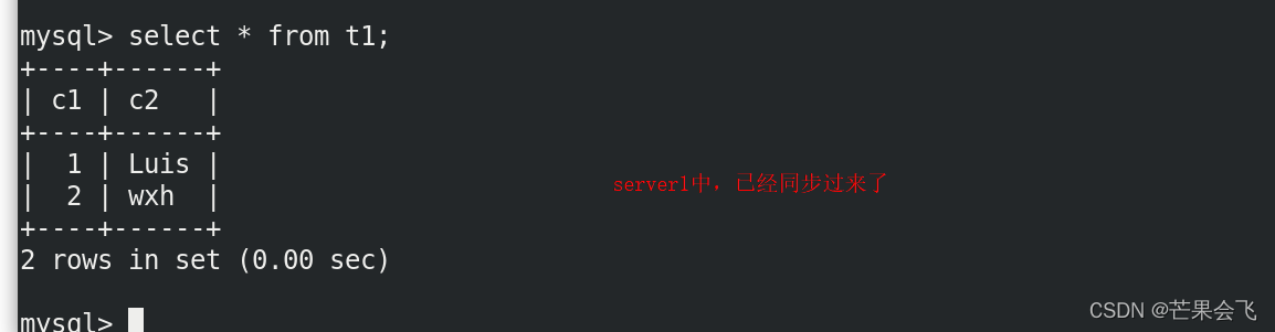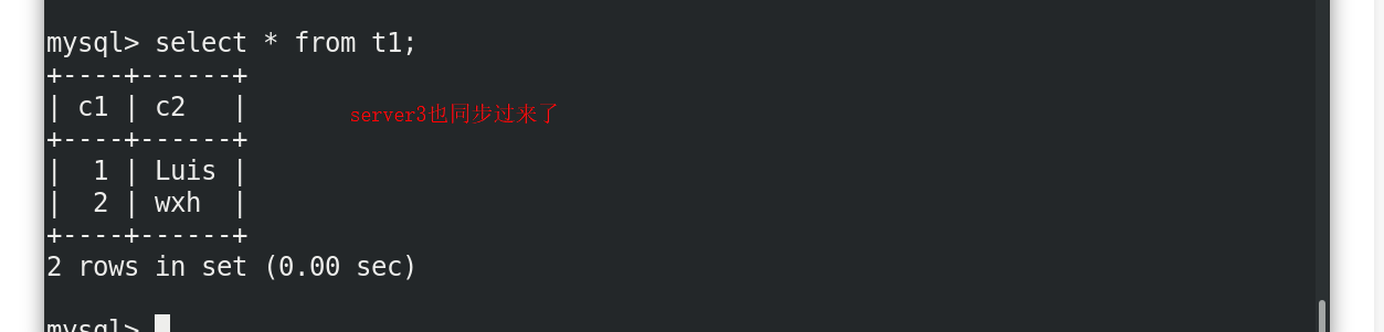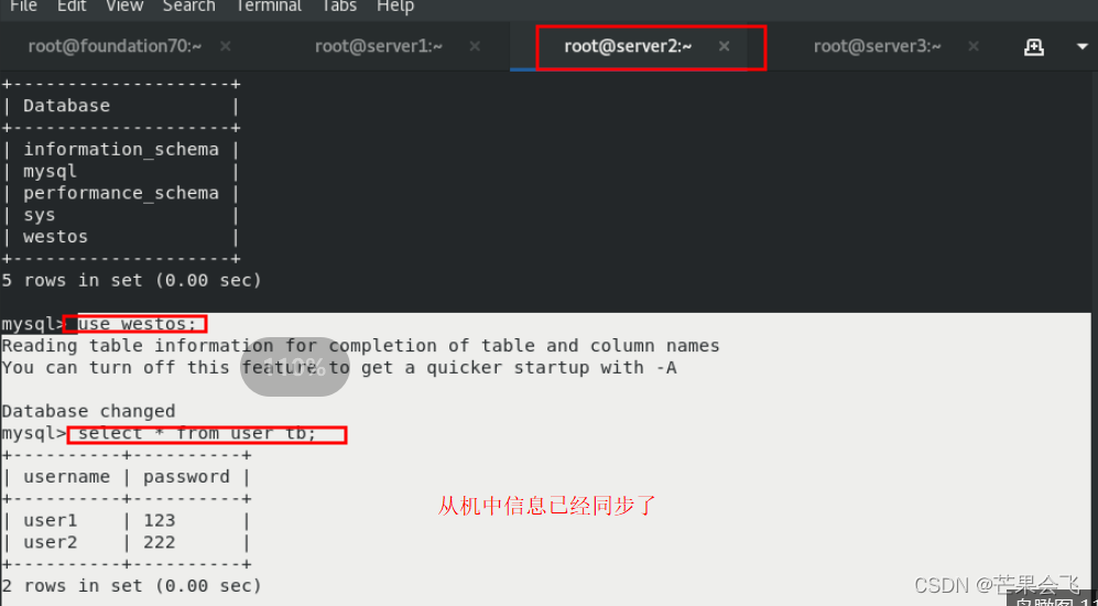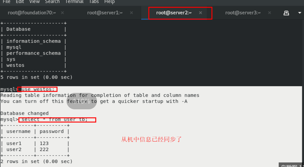 --> select * from user_tb; #同步过来2上的库里的信息了
